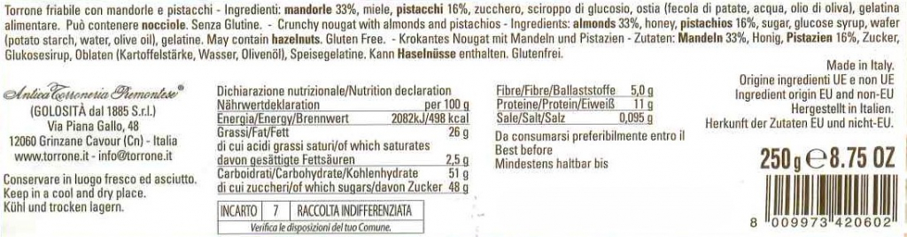 Antica Torroneria Piemontese Torrone Friabile 250 g. Mandorla e Pistacchio