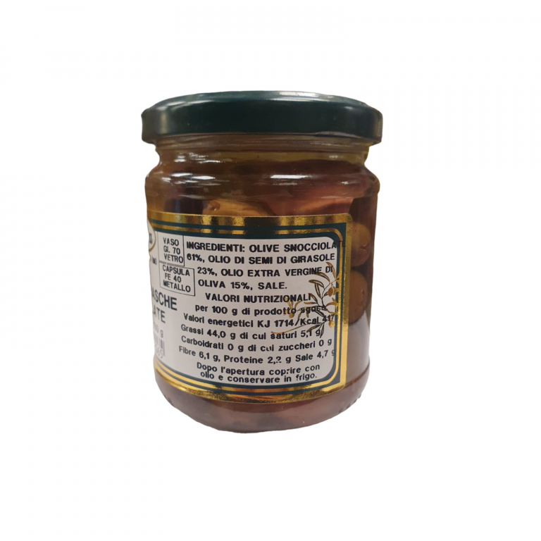 ingredienti: olive denocciolate 61%, olio di semi di girasole 23%, olio extra-vergine di oliva 15%, sale