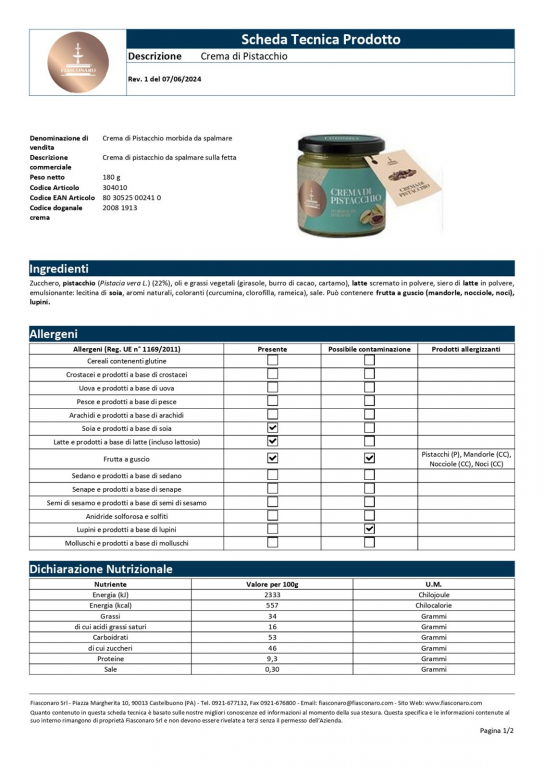 Ingredienti: zucchero, pistacchio (Pistacia vera 22%),grassi vegetali (girasole, burro di cacao, latte scremato in polvere , siero di latte polvere, emulsionante: lecitina di soia, aromi naturali, coloranti (curcumina, clorofilla rameica), sale.