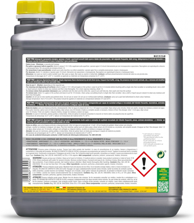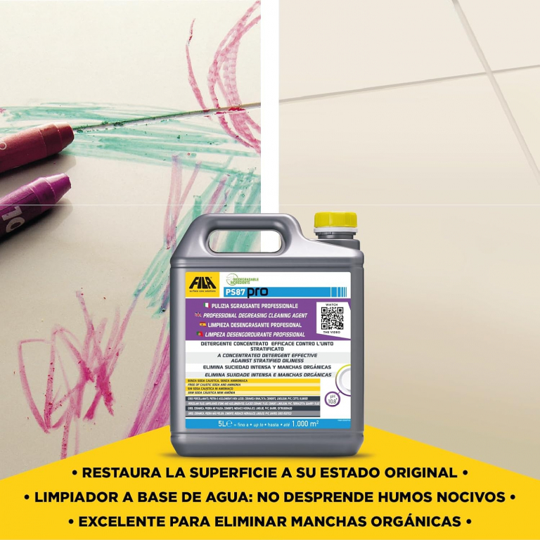 Diluito, pulisce e sgrassa pavimenti molto sporchi in gres porcellanato, ceramica, pietra naturale, cotto e cemento.