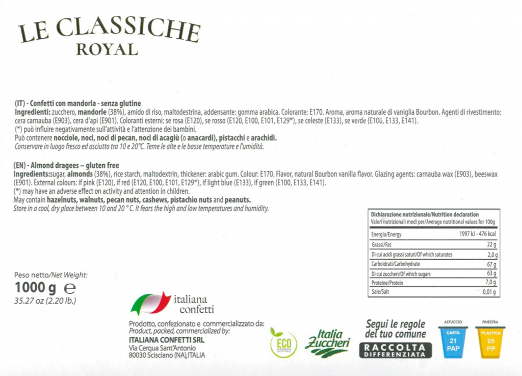 Zucchero, mandorle (38%), amido, maltodestrina, gomma arabica. Colorante: E171. Aromi. Agenti di rivestimento: cera carnauba (E903), cera d'api (E901). Coloranti esterni: rosa (E120), rosso (E120, E100, E101), celeste (E133).