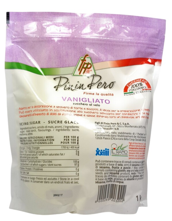 Produttore: Pinin Pero & C. S.p.A. Sede: Nizza Monferrato (AT), Piemonte, Italia. Tipologia: Zucchero al velo aromatizzato. Formato: Confezione da 1 kg. Ingredienti: Zucchero, amido di mais (3%), aromi. Allergeni: Assenti. Senza glutine. Caratteristiche e Benefici: