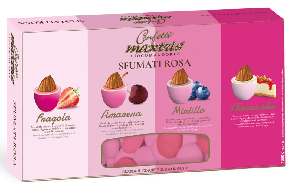 Mandorla tostata ricoperta da uno strato di cioccolato bianco ai gusti assortiti (fragola, amarena, mirtillo e cheesecake) e da un sottile strato di zucchero.
