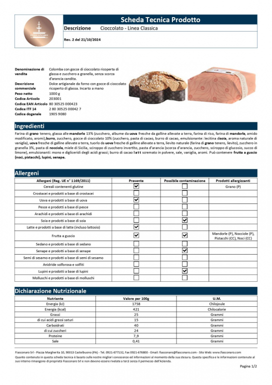 Produttore: Fiasconaro (Castelbuono, Sicilia). Tipologia: Dolce pasquale a lievitazione naturale con gocce di cioccolato. Formato: Confezione da 1 kg. Ingredienti: Farina di grano tenero, burro, zucchero, uova fresche, gocce di cioccolato (12%) (zucchero, pasta di cacao, burro di cacao, emulsionante: lecitina di girasole, aroma naturale di vaniglia), lievito naturale, miele di Sicilia, zucchero invertito, emulsionante: mono e digliceridi degli acidi grassi, burro di cacao, latte scremato in polvere, sale, aromi naturali: bacche di vaniglia. Glassa: zucchero, albume d’uovo fresco, farina di riso, cacao, mandorle, aromi. Allergeni: Grano (glutine), latte, uova, mandorle. Può contenere tracce di altra frutta a guscio e soia.