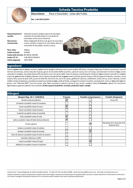Produttore: Fiasconaro (Castelbuono, Sicilia). Tipologia: Dolce pasquale a lievitazione naturale con frutta e cioccolato. Formato: Confezione da 1 kg. Ingredienti: Farina di grano tenero, burro, zucchero, uova fresche, pere candite (pere, sciroppo di glucosio-fruttosio, zucchero), gocce di cioccolato (zucchero, pasta di cacao, burro di cacao, emulsionante: lecitina di girasole, aroma naturale di vaniglia), lievito naturale, pasta di nocciola, miele di Sicilia, zucchero invertito, emulsionante: mono e digliceridi degli acidi grassi, burro di cacao, latte scremato in polvere, sale, aromi naturali: bacche di vaniglia. Glassa: zucchero, albume d’uovo fresco, farina di riso, farina di nocciole, amido modificato, aromi. Allergeni: Grano (glutine), latte, uova, nocciole. Può contenere tracce di altra frutta a guscio e soia.