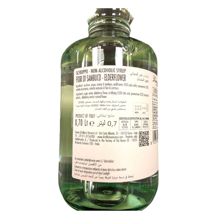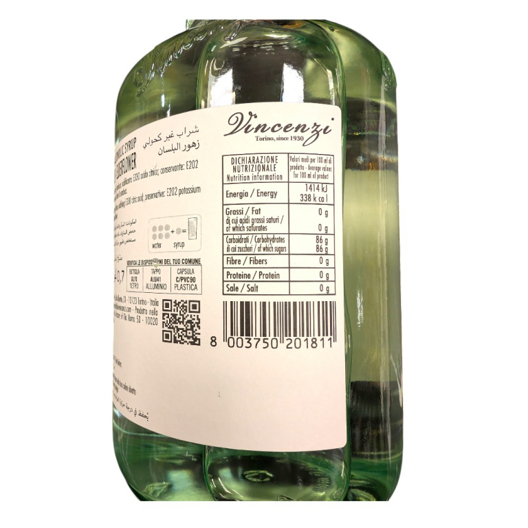 ingredienti: zucchero, acqua, aroma di sambuco, acidificante E330 acido citrico, conservare E202 sorbitolo di potassio, estratto naturale di fiori di sambuco