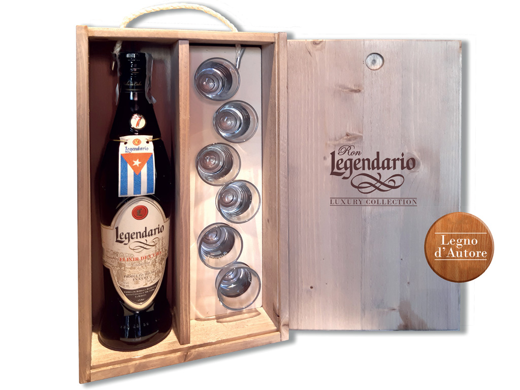 1 bottiglia di Elixir de Cuba (70 cl), 6 chupito in vetro, inseriti in un piccolo vassoio in legno estraibile