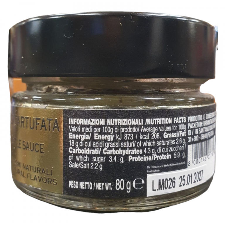 Ingredienti: funghi champignons(agaricus bisporus) 54%, acqua, olio extra vergine di oliva, tritume di tartufi estivi (tuber aestivum vitt.) 8%, sale, aromi naturali, agliio, fibra vegetale, succo di limone, pepe nero