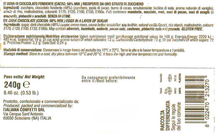 Ingredienti: zucchero, cioccolato fondente (35%) (zucchero, pasta di cacao, burro di cacao. Emulsionante: lecitina di SOIA. Aroma naturale di vaniglia), amido di riso, maltodestrina, aromi. Coloranti: E170, E120, E160a, E133, E100.