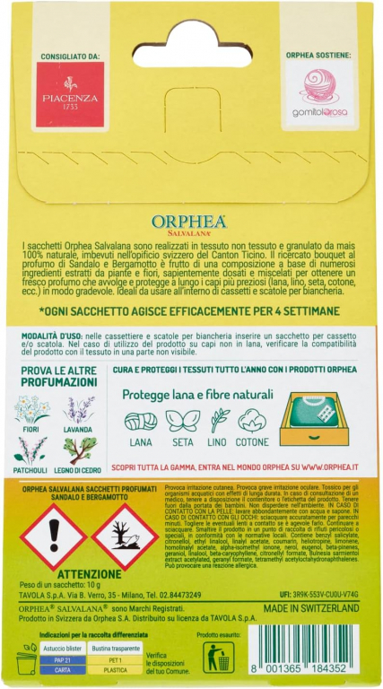 Con i sacchetti Orphea Salvalana al profumo di Sandalo e Bergamotto, i tuoi abiti e la tua biancheria non solo saranno protetti, ma anche avvolti in un'atmosfera di sofisticata armonia!