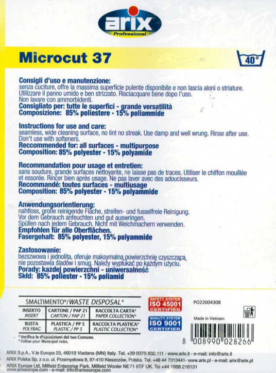 Panno multiuso in microfibra tessile lavorata con tecnologia laser-cut. L’assenza di cuciture consente di sfruttare la massima superficie pulente disponibile, senza lasciare aloni o striature.