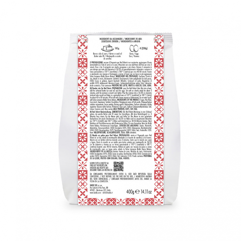 Prepara in pochi step la famosa ricetta americana della torta dall'impasto di colore rosso acceso, la Red Velvet. Il Preparato per Red Velvet Babbi Home Bakery è un mix in polvere GLUTEN FREE che può essere utilizzato sia per cucinare la tipica torta che per preparare originali cupcakes! ISTRUZIONI DI CONSERVAZIONE: Tutti i prodotti della linea Babbi Home Bakery, una volta aperti, possono essere conservati a temperatura ambiente fino alla data di scadenza riportata sulla confezione. Si raccomanda di utilizzare sempre utensili (spatole, cucchiai, ecc.) puliti e asciutti per prelevare polveri / paste/ salse dalle confezioni. Lasciati ispirare dalle proposte Babbi: leggi le RICETTE nella sezione dedicata.