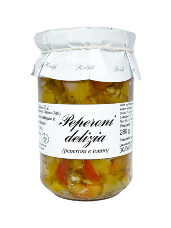 Produttore: Riolfi Sapori. Sede: Castelnuovo Calcea (AT), Piemonte, Italia. Tipologia: Specialità gastronomica in olio (Peperoni farciti). Formato: Vasetto in vetro da 280 g. Ingredienti: Peperoni (35%), olio di semi di girasole, tonno (20%), capperi, aceto di vino, sale, aromi naturali. Allergeni: Pesce (tonno). Può contenere tracce di sedano.