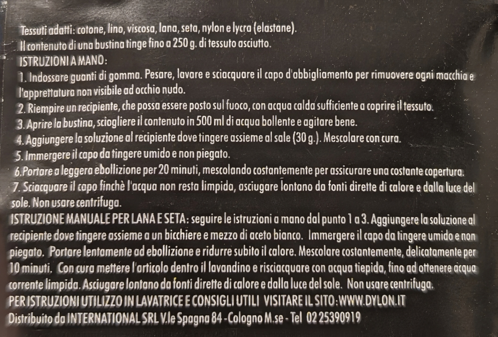 • Ricorda che i tessuti sintetici (poliestere, acrilico, nylon) non assorbono questo tipo di colorante o potrebbero dare risultati non uniformi.