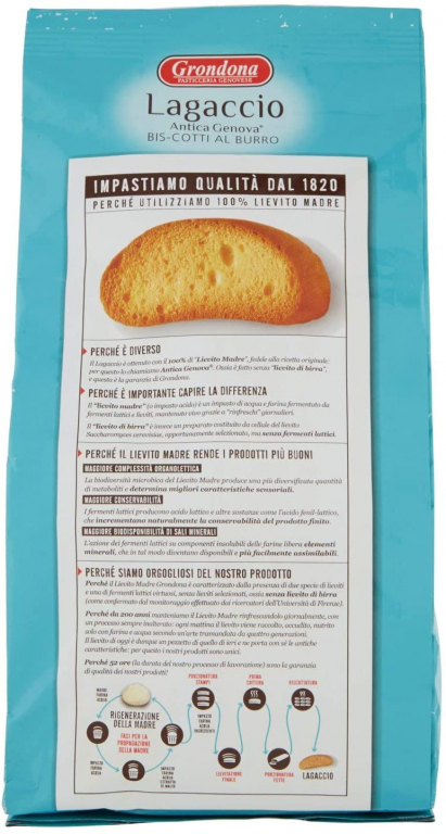- Ingredienti: Farina di frumento, lievito naturale (da madre bianca Grondona), zucchero, burro (12%) e malto d'orzo.