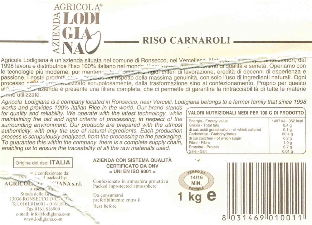 Produttore: Agricola Lodigiana S.r.l. a socio unico (Ronsecco, Vercellese, Piemonte). Tipologia: Riso Carnaroli, classificato come riso supersino. Peso: 1 Kg. Origine: 100% Riso Italiano.