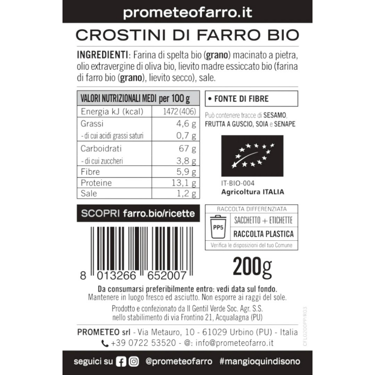 Produttore: Prometeo (specialista del farro integrale e biologico). Tipologia: Crostini / Pane tostato di farro. Ingrediente Principale: Farro di alta qualità, coltivato seguendo filiere controllate. Formato: Confezione da 200 g. Caratteristiche: Prodotti con farina di farro, un cereale antico meno raffinato del frumento, noto per l'elevata digeribilità e il basso indice glicemico.