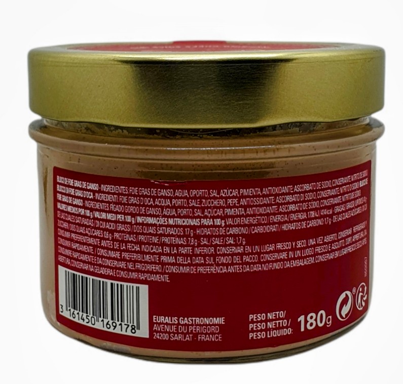 senza conservantiingredienti: blocco di fegato d'oca, acqua, porto, sale, zucchero, pepe, antiossidante ascorbato di sodio, conservante nitrito di sodio.