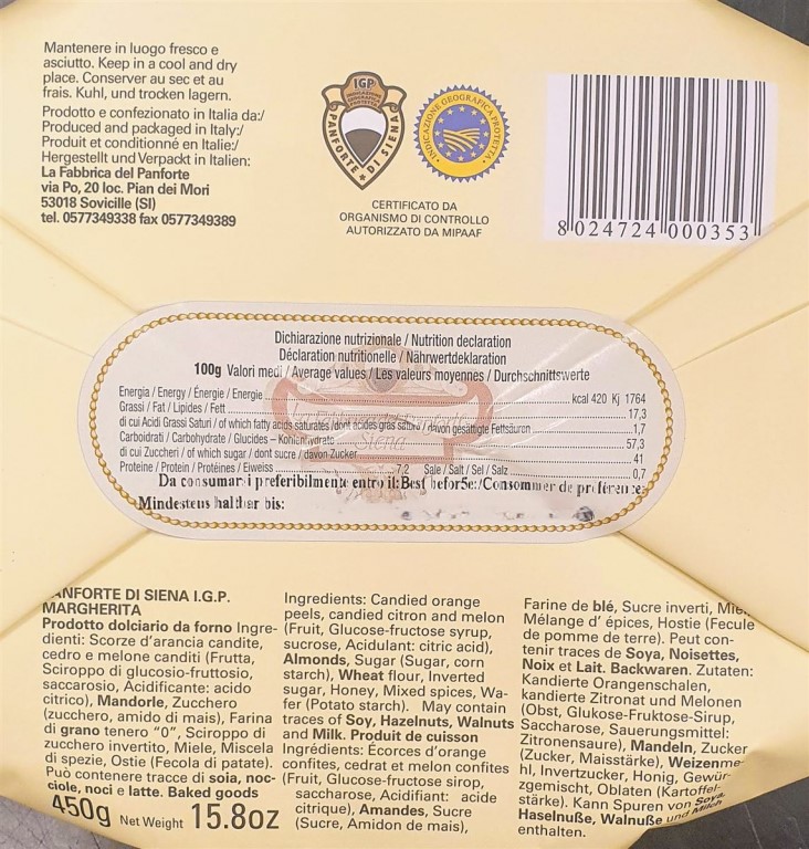 Ingredienti: Scorze d’arancia candite, cedro e melone canditi (Frutta, Sciroppo di glucosio-fruttosio, Saccarosio, Acidificante: acido citrico), Mandorle, Zucchero (zucchero, amido di mais), Farina di grano tenero “0”, Sciroppo di zucchero invertito, Miele, Miscela di spezie, Ostie (Fecola di patate). Può contenere tracce di soia, nocciole, noci e latte.