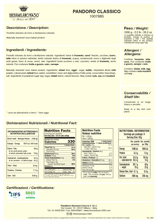 Il Pandoro Classico di BreraMilano1930 è l’esempio che con ingredienti semplici ma di qualità si può creare un dolce ricco di sapore. L’impasto è un’esaltazione dello zucchero e del burro, che abbinata ad una lavorazione metodica e curata, si concretizzerà in un dolce soffice a forma di stella da decorare con la bustina di zucchero a velo in dotazione. Il prodotto viene avvolto da un incarto che rispecchia lo stile tradizionale delle pasticcerie milanesi, ispirandosi ai disegni degli anni ‘30.Pandoro tradizionale incartato 1 kg.