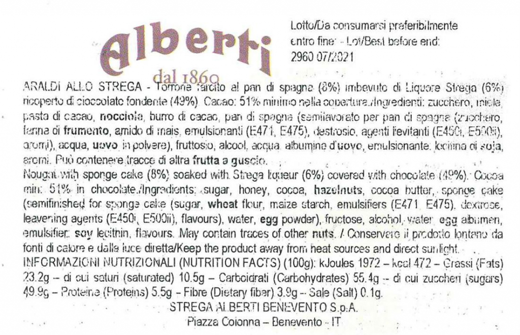 Ingredienti: Zucchero, miele, pasta di cacao, nocciole, burro di cacao, pan di spagna, farina di frumento, amido di mais, latte scremato in polvere, maltodestrine, emulsionanti (E471, E472b, E477) agenti lievitanti (E450, E500ii), acqua, fruttosio, alcool, uovo intero in polvere, albumina d'uovo, emulsionante: lecitina di soia, aromi