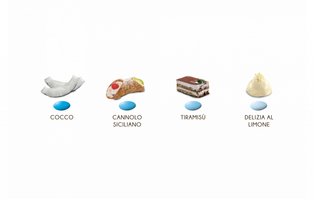 Mandorla tostata ricoperta da uno strato di cioccolato bianco ai gusti assortiti (cocco, cannolo siciliano, tiramisù e delizia al limone) e da un sottile strato di zucchero.