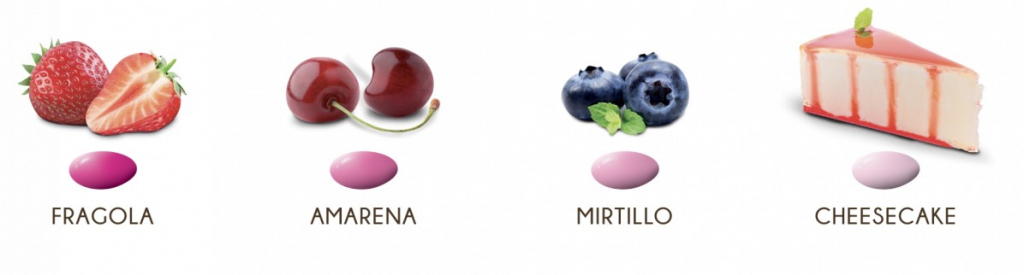 Mandorla tostata ricoperta da uno strato di cioccolato bianco ai gusti assortiti (fragola, amarena, mirtillo e cheesecake) e da un sottile strato di zucchero.