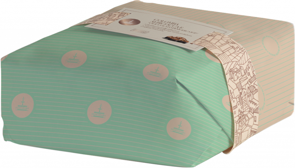 Colomba con canditi d' albicocca e “Cioccolato di Modica IGP” ricoperta di glassa e fogliame di nocciole, senza scorza d'arancia.