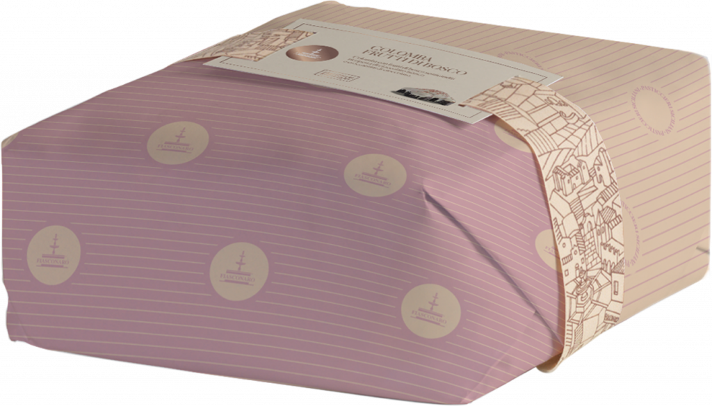 Colomba con frutti di bosco semicanditi ricoperta di cioccolato bianco e croccantini di cioccolato, confezionata a mano.