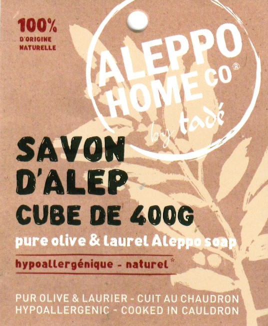 Produttore: Tadé Pays du Levant. Sede: Francia (produzione artigianale secondo tradizione siriana). Tipologia: Sapone solido naturale. Formato: Cubo da 400 g. Ingredienti: Olio di oliva (Olea Europaea Fruit Oil), olio di bacche d'alloro (Laurus Nobilis Fruit Oil), acqua, idrossido di sodio. Allergeni: ASSENTI (non contiene profumi sintetici, coloranti o conservanti).