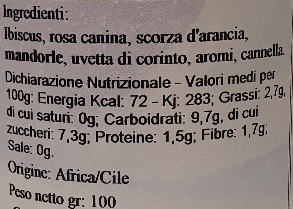 ingredienti: Ibisco, rosa canina, scorza d'arancia, mandorle, uvetta di corinto, aromi, cannella