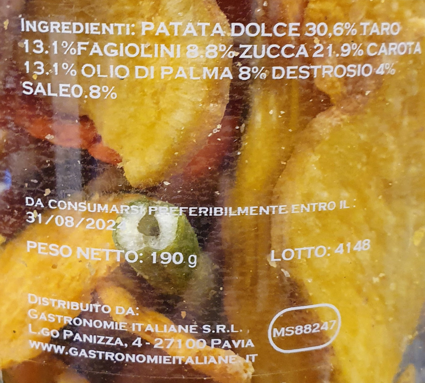 Produttore: Gastronomie Italiane. Sede: Via Aurelia nord, 62, 55049 Viareggio (LU), Italia. Tipologia: Snack di verdure fritte. Formato: Confezione da 190 g. Ingredienti:patata dolce 30,6%, zuccha 21,9%, taro 13,1%, carota 13,1%, fagiolini 8,8%, olio di palma 8%, destrosio 4%, sale 0,8%. Allergeni: NESSUNO. PUÒ CONTENERE TRACCE DI SEDANO.