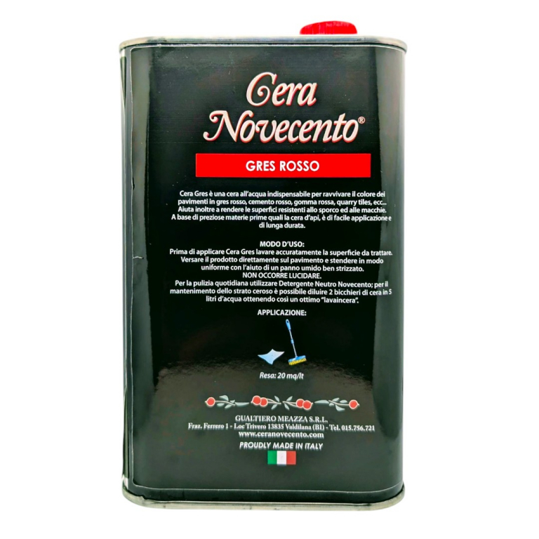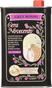 Cera Gres Rosso Novecento è una cera liquida all’acqua, autolucidante e tingente speciale per pavimenti in gres rosso, cemento rosso, pavimenti industriali rossi, quarry tiles e gomma rossa.