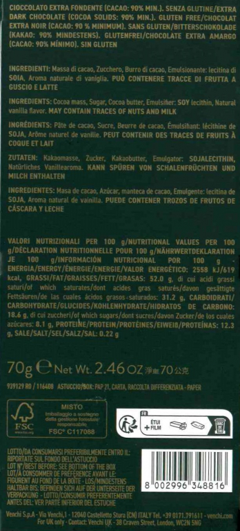 Venchi Tavoletta Cioccolato Fondente 90% Avvolgente Ricco 70 g.