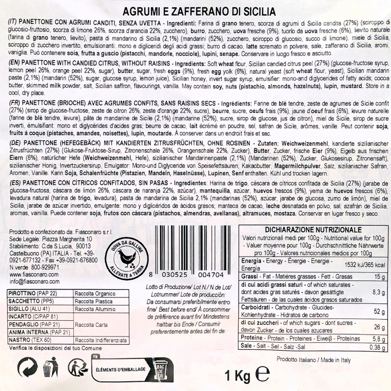 Panettone agli agrumi e zafferano di Sicilia Fiasconaro, lievitato naturalmente per 36 ore garantendo ineguagliabile leggerezza e fragranza. Un equilibrio di odori e sapori: i canditi di arancia e limone regalano una dolce nota di freschezza e offrono un profumo che conquista tutti; lo zafferano, una delle spezie più pregiate al mondo, regala a questo panettone artigianale un colore dorato intenso e un sapore unico.