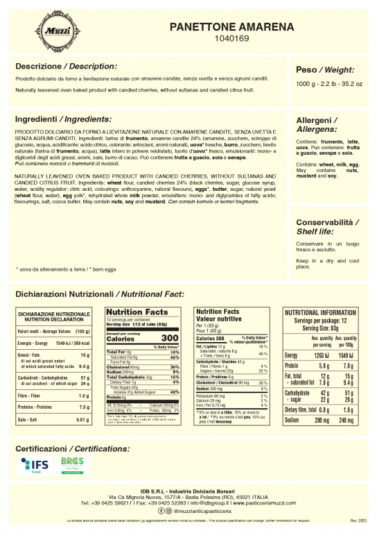 Il Panettone Amarena, al primo taglio, rivela una trama soffice e ariosa, frutto di una lievitazione naturale lunga e paziente. Ma la vera sorpresa arriva quando, tra l’impasto, appaiono le amarene candite (24% sul peso totale): piccoli tesori rossi e succosi che, rilasciando il loro sciroppo, trasmettono al prodotto un gusto molto preciso e riconoscibile. Il Panettone Amarena nel formato da 1 kg è incartato a mano in uno splendido packaging natalizio.