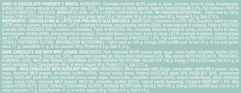 Immagina un coniglio dalle lunghe orecchie dorate che saltella con vivacità nel giardino fiorito di un mondo incantato. Ferma il tempo. Immergiti nella sensazione rinfrescante del cioccolato fondente e menta. Scopri il prezioso segreto custodito all’interno: il sapore unico delle Margherite Streglio.
