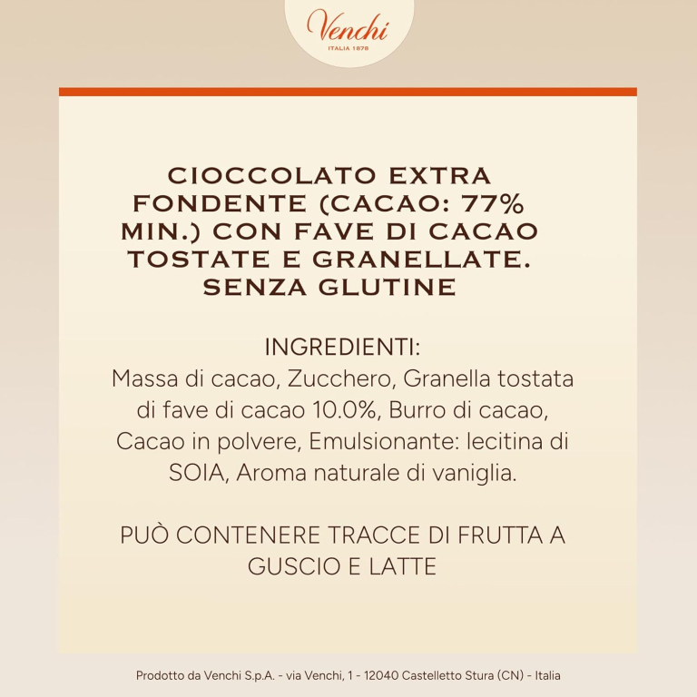 Ogni prodotto è un capolavoro che prende forma attraverso ingredienti pregiati e materie prime d'eccellenza, lavorate con passione e maestria artigianale. Come i fiori che sbocciano illuminati dai primi raggi di sole, anche le uova di cioccolato e i cofanetti Venchi racchiudono una sorpresa che attende solamente di essere svelata. Pregiate miscele di cacao extra fondente al 77%, arricchite da croccante granella di fave di cacao tostate per una consistenza unica e un sapore voluttuoso. Quest'uovo di cioccolato rivela note lievi di fonduta di frutta, spezie dolci e noce. Perfetto per abbinamenti con caffè, tè karkadè, vini rossi e passiti, o succhi di frutta.