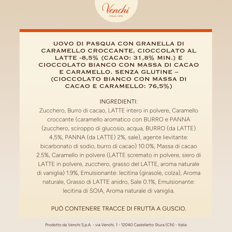 Venchi - Uovo di Cioccolato,150 Gr, Gusto Caramello e Toffee Salato con Granella Croccante, Senza Glutine, con Sorpresa, Collezione Pasqua Venchi, Idea Regalo
