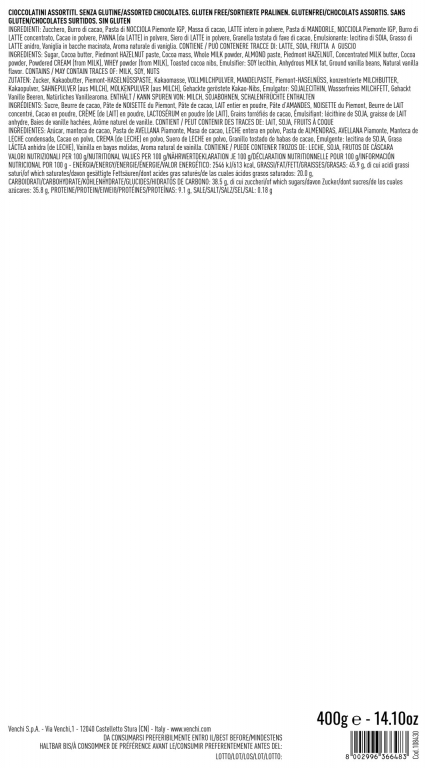 CIOCCOLATINI ASSORTITI. SENZA GLUTINE INGREDIENTI: Zucchero, Burro di cacao, Pasta di NOCCIOLA Piemonte IGP, Massa di cacao, LATTE intero in polvere, Pasta di MANDORLE, NOCCIOLA Piemonte IGP, Burro di LATTE concentrato, Cacao in polvere, PANNA (da LATTE) in polvere, Siero di LATTE in polvere, Granella tostata di fave di cacao, Emulsionante: lecitina di SOIA, Grasso di LATTE anidro, Vaniglia in bacche macinata, Aroma naturale di vaniglia. CONTIENE / PUÒ CONTENERE TRACCE DI: LATTE, SOIA, FRUTTA A GUSCIO