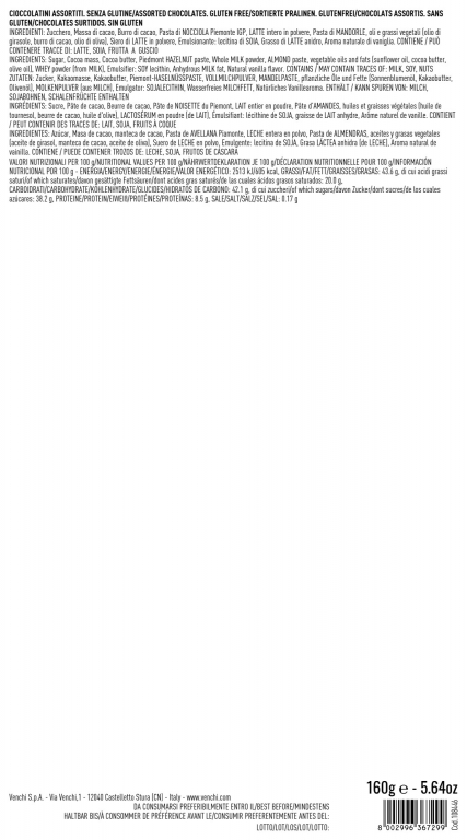 CIOCCOLATINI ASSORTITI. SENZA GLUTINE INGREDIENTI: Zucchero, Massa di cacao, Burro di cacao, Pasta di NOCCIOLA Piemonte IGP, LATTE intero in polvere, Pasta di MANDORLE, oli e grassi vegetali (olio di girasole, burro di cacao, olio di oliva), Siero di LATTE in polvere, Emulsionante: lecitina di SOIA, Grasso di LATTE anidro, Aroma naturale di vaniglia. CONTIENE / PUÒ CONTENERE TRACCE DI: LATTE, SOIA, FRUTTA A GUSCIO