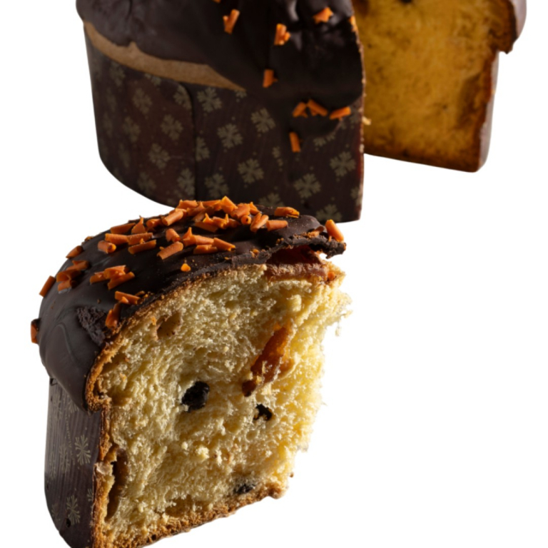 L’impasto, lasciato lievitare lentamente, è impreziosito da una copertura di cioccolato fondente e riccioli arancioni di cioccolato.
