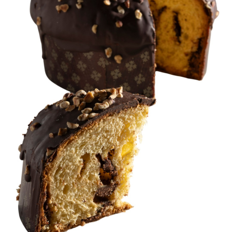 PRODOTTO DOLCIARIO DA FORNO A LIEVITAZIONE NATURALE CON PEPITE DI CIOCCOLATO GIANDUIA, RICOPERTO DI CIOCCOLATO FONDENTE, CON GRANELLA ALLE NOCCIOLE. SENZA AGRUMI CANDITI E UVETTA. Ingredienti: farina di FRUMENTO, pepite di cioccolato al gianduia 16% (zucchero, pasta di NOCCIOLE 22%, burro di cacao, pasta di cacao, emulsionante: lecitina di SOIA, estratto di vaniglia – Cacao: 32% min.), tuorlo d’UOVA* fresco, BURRO, zucchero, lievito naturale (farina di FRUMENTO, acqua), gocce di cioccolato fondente (zucchero, pasta di cacao, burro di cacao, emulsionante: lecitina di girasole; aroma naturale di vaniglia), cioccolato fondente di copertura 6% (zucchero, pasta di cacao, burro di cacao, emulsionante: lecitina di girasole; aroma naturale di vaniglia), granella di NOCCIOLE 2%, crema al gianduia [sciroppo di glucosio – fruttosio, acqua, zucchero, destrosio, cioccolato gianduia 10% (cacao magro, NOCCIOLE 20%, burro di cacao, zucchero), pasta di NOCCIOLE 7%, LATTE scremato in polvere, alcool, aromi, addensanti: pectina; conservanti: potassio sorbato], sciroppo di zucchero invertito, estratto di vaniglia, pasta di NOCCIOLE, semi di vaniglia. Può contenere ALTRA FRUTTA A GUSCIO e SENAPE. *uova da allevamento a terra