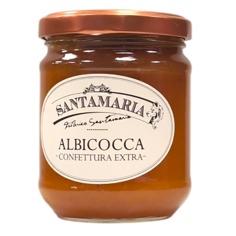 Produttore: Santamaria (Azienda nota per la cura nella selezione della materia prima e le lavorazioni a bassa temperatura). Tipologia: Confettura Extra (caratterizzata da un'alta percentuale di frutta per 100 g di prodotto). Ingredienti: Albicocche di prima scelta, zucchero di canna. Senza aggiunta di coloranti o conservanti artificiali. frutta utilizzata 110 g. per 100 g zuccheri totali 60 g per 100 g. Formato: Vasetto in vetro da 230 g.