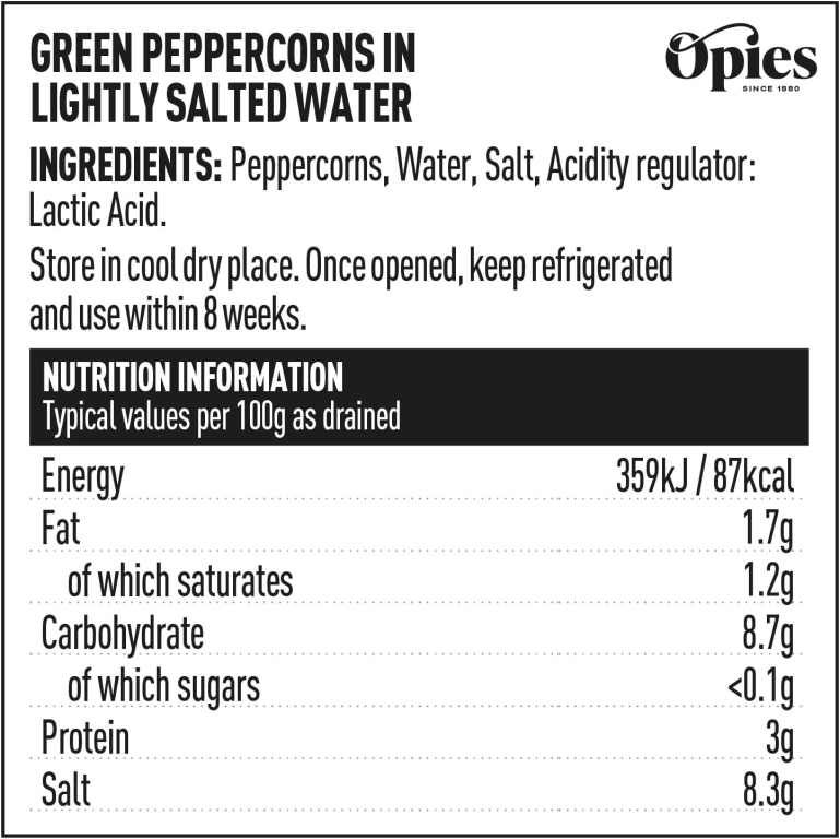 Produttore: Bennett Opie Ltd. Sede: Sittingbourne, Kent, Inghilterra (Regno Unito). Tipologia: Pepe verde in salamoia. Formato: Vaso in vetro da 115 g (Peso sgocciolato: circa 70 g). Ingredienti: bacche di pepe verde, acqua, sale, correttore d'acidità: acido citrico. Allergeni: NESSUNO.