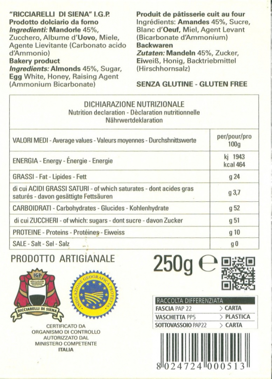 Ingredienti: Mandorle 45%, Zucchero, Albume d’uovo, Miele, Agente lievitante (Carbonato acido d’ammonio), Conservante: acido sorbico.