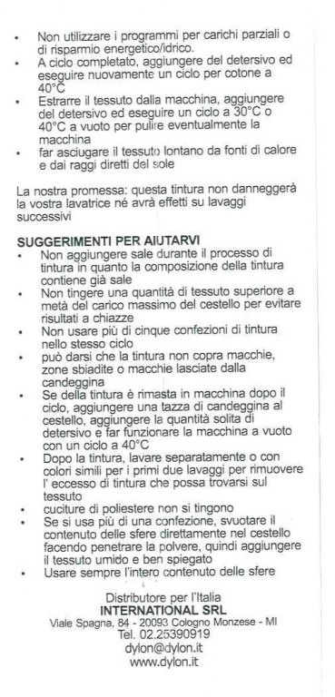 5 rimuovere il tessuto ed eventualmente effettuare un ultimo ciclo a 40° per riumuovere eventuali residui di colorazione dal cestello.
